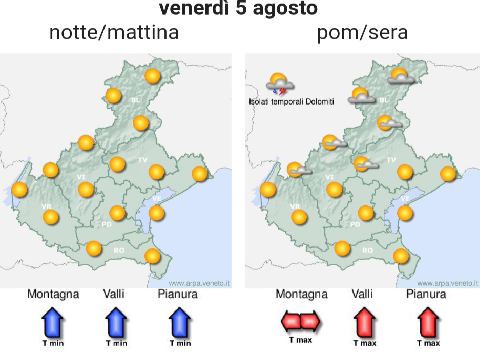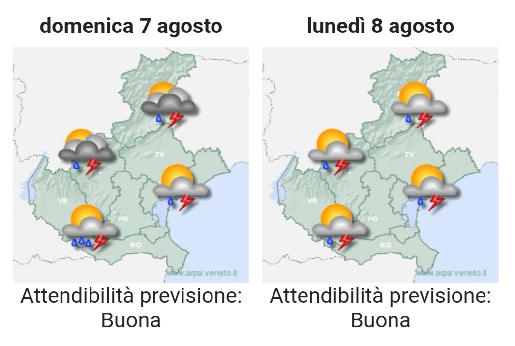 Precipitazioni. Fino al mattino assenti. Nella seconda metà di giornata sui monti probabilità medio-alta (50-75%) per piogge diffuse e sulla pianura andando dalla pedemontana alla costa probabilità da medio-bassa (25-50%) a bassa (5-25%) per piogge da sparse a locali; si tratterà di piovaschi/rovesci/temporali.