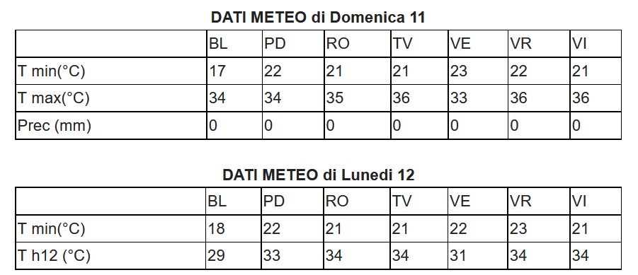 Precipitazioni: Fino al mattino, assenti; da metà giornata, in montagna possibili fenomeni da locali a sparsi perlopiù a carattere di rovescio o temporale, in pianura generalmente assenti salvo al più isolati rovesci temporaleschi.