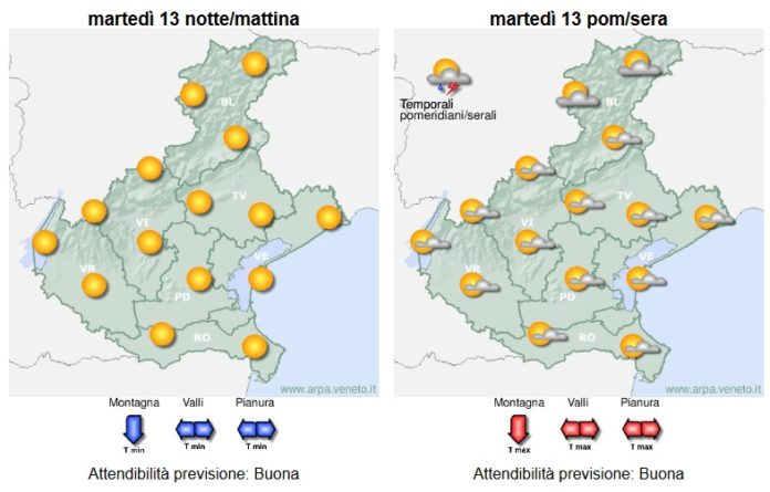Cielo in prevalenza da poco a parzialmente nuvoloso, con spazi di sereno più presenti fino al mattino e sulle zone pianeggianti, maggiori addensamenti su quelle montane dal pomeriggio; precipitazioni in pianura generalmente assenti, in montagna possibili specie sulle Dolomiti da metà giornata con rovesci temporaleschi da locali a sparsi; contenute variazioni di carattere locale riguardo ai valori termici.