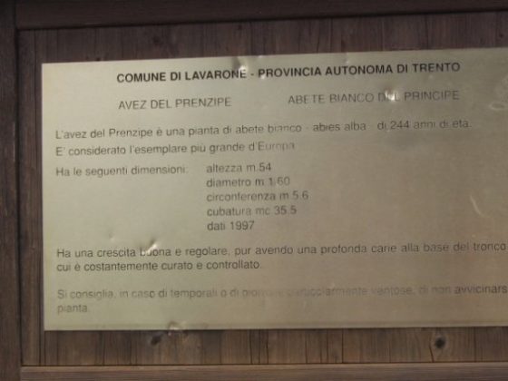 L’Avez del Prinzep, era insomma un vero e proprio monumento della natura. Un vecchio abete bianco, forse il più alto d’Europa, che aveva dato vita anche a un sentiero escursionistico nella zona di Malga Laghetto: era alto 54 metri, aveva una circonferenza di 5,6 metri e nel 1997 stime ne avevano stimato l’età in 244 anni. Avez in dialetto trentino sta per abete bianco mentre Prinzep trae origine da un racconto popolare secondo cui la pianta sarebbe appartenuta al Capo-comune di Luserna, soprannominato appunto Prinzep.
