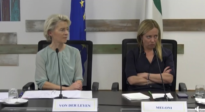 Meloni ha dichiarato: “Come avete visto la presidente della Commissione europea Ursula von der Leyen ha immediatamente accettato l’invito a venire qui per rendersi conto della situazione a Lampedusa. Non lo considero tanto un gesto di solidarietà verso l’Italia ma un gesto di responsabilità dell’Europa verso se stessa perché i confini dell’Italia sono i confini dell’Europa. Continuo a dire che di fronte ai flussi non risolveremo mai il problema parlando di redistribuzione. L’unico modo di affrontare seriamente il problema è fermare le partenze illegali. Questo è quello che ci chiedono i cittadini ma anche i rifugiati”.