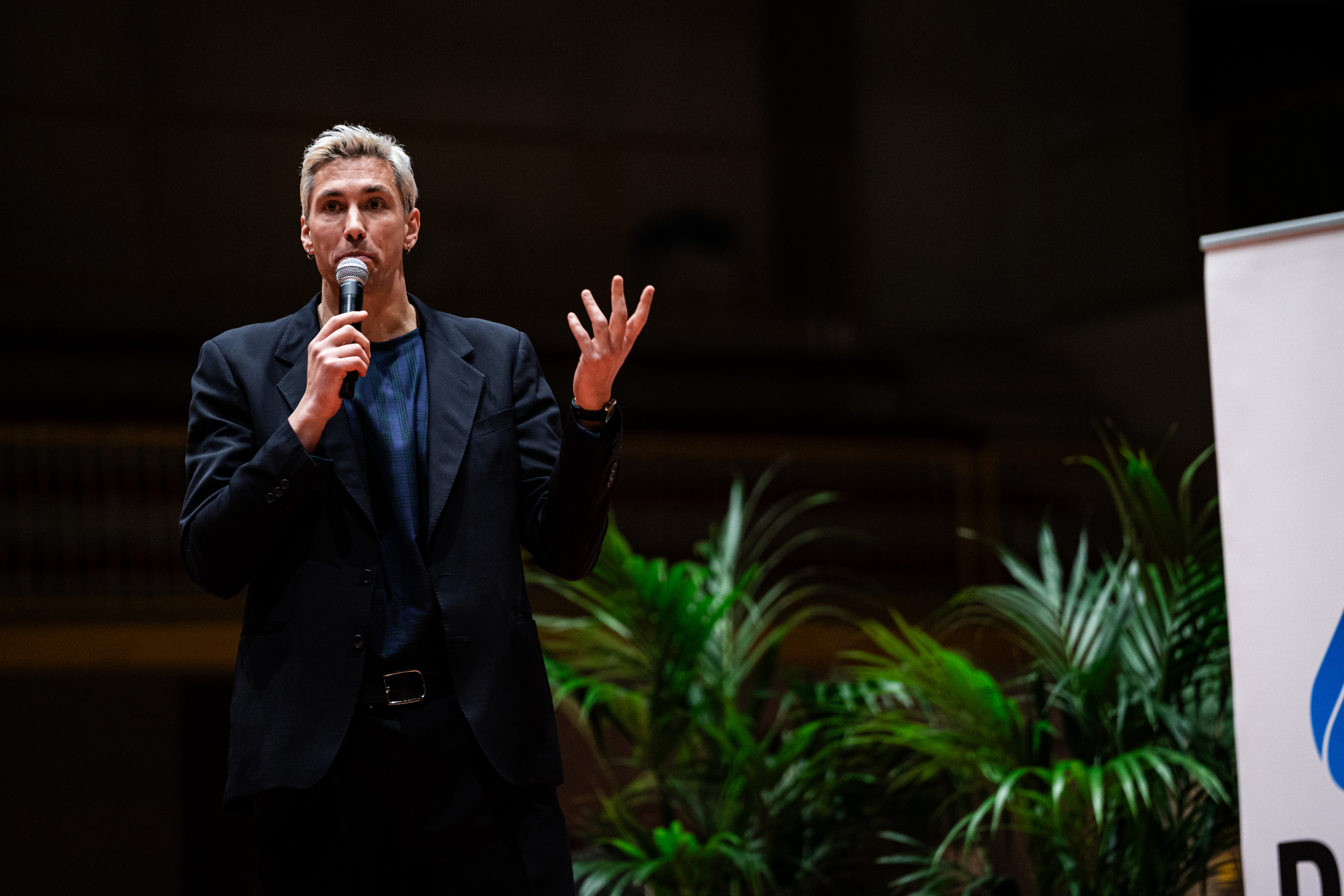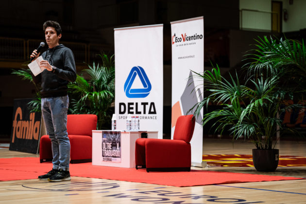 Il saluto istituzionale dell’Assessore allo Sport Aldo Munarini, il ringraziamento alla società di casa al PalaRomare Famila Basket Schio e a tutti i partner, L’Eco Vicentino compreso in qualità di media partner, il benvenuto a ciascuno dei circa 1.200 presenti. L’introduzione è affidata a due allenatori, come oggi è Alex, Tobia Masetto e Nicola Retis, cuori pulsanti dell’iniziativa. Dei cenni per spiegare come è nata l’idea che ha portato alla serata con Alex Schwazer, svelare a chi è principalmente rivolta e salutare i ragazzi/atleti in prima linea della realtà sportiva di Delta Sport Performance. Poi si entra nel vivo: la presentazione di Jacopo Pozzi, ex atleta, podcaster e giornalista in vesti di interlocutore speciale designato a mettersi in marcia con l’olimpionico. Che si presenta in jeans e camicia, dopo aver lasciato la scorsa estate canotta e pantaloncini, arrivato da Vipiteno dove vive con la moglie e i due loro pargoli per incontrare Schio e chi ha voluto ascoltarlo. E più volte applaudirlo spontaneamente.