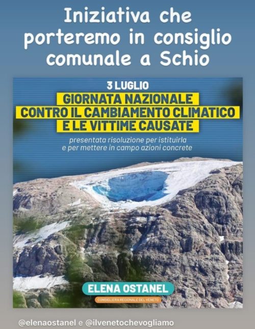 Ad annunciare che l’iniziativa di istituire il 3 luglio “Giornata nazionale contro il cambiamento climatico e le vittime causate” sarà portata anche in Consiglio comunale a Schio è Giorgio De Zen, consigliere comunale di Coalizione Civica e portavoce regionale de Il Veneto che Vogliamo.