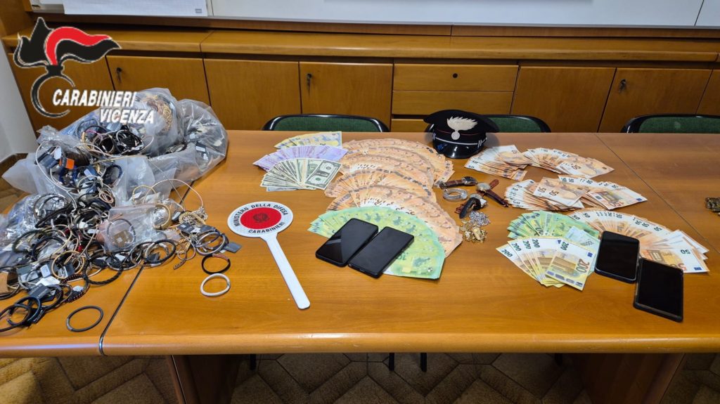Nel corso delle indagini i carabinieri hanno constato che il terzetto agisse in tutto il nord Italia, spingendosi anche in Toscana, Emilia-Romagna e Marche, a bordo di autovetture di grossa cilindrata intestate a terzi e con apposte targhe clonate/contraffatte. I colpi avevano tutti le stesse modalità: colpivano aziende con una predilezione per le ditte orafe. Lo hanno confermato anche le perquisizioni presso le abitazioni dei tre indagati: in un garage di Trezzano sul Naviglio – base logistica della banda – venivano parcheggiate le auto usate per le scorribande e stipata parte della refurtiva. Durante le perquisizioni i carabinieri di Bassano del Grappa hanno rinvenuto quasi 53 mila euro e più di duemila dollari in contanti, cinque orologi di pregio, 11 traveller’s cheques del valore di 940 dollari, monili vari quali bracciali, collane e parti di esse, diversi scarti di argento per un peso complessivo di oltre 23 chili, due targhe clonate, 63 proiettili di vari calibri e una pistola calibro 9X21 (risultata rubata a settembre 2024 ad un imprenditore orafo di Arezzo, durante un ingente furto in azienda).