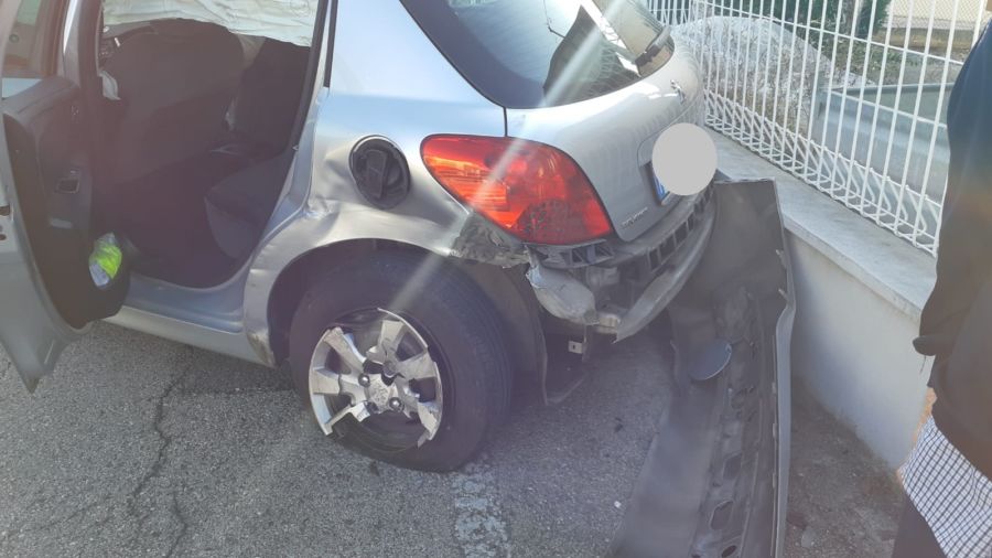 Una delle due vetture coinvolte dopo l'urto sul marciapiede e un muretto