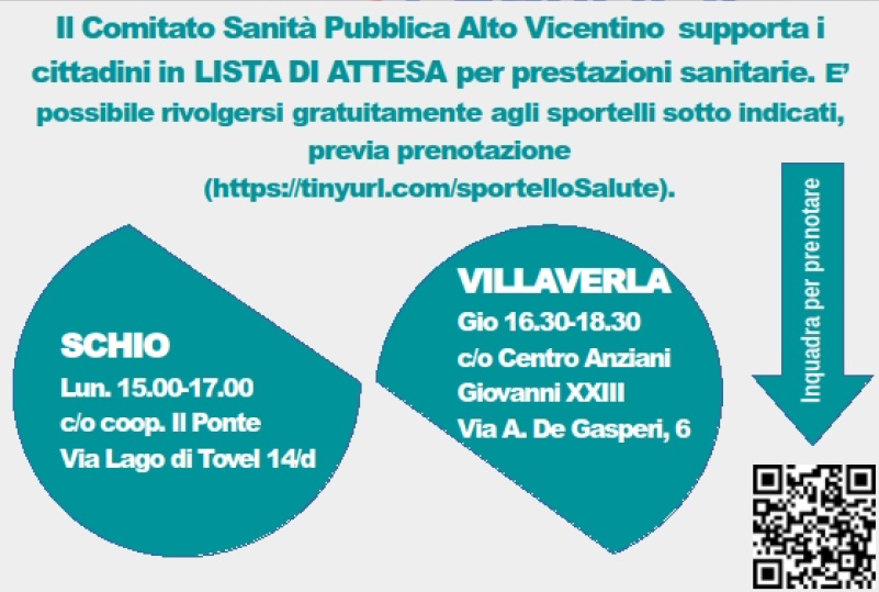 Liste di galleggiamento e, molto spesso, non risposte: l’esperienza dei cittadini contrasta con gli annunci della Regione e dei manager delle Ulss del Veneto. Per questo il Comitato Sanità Pubblica Alto Vicentino ha aperto due sportelli (uno a Schio, l’altro a Villaverla) a cui i cittadini si possono ora rivolgere allo scopo di redigere ed inviare ricorsi in autotutela per chiedere il rispetto dei tempi prescritti in ricetta e per contrastare il fenomeno delle liste di attesa nel sistema sanitario regionale.