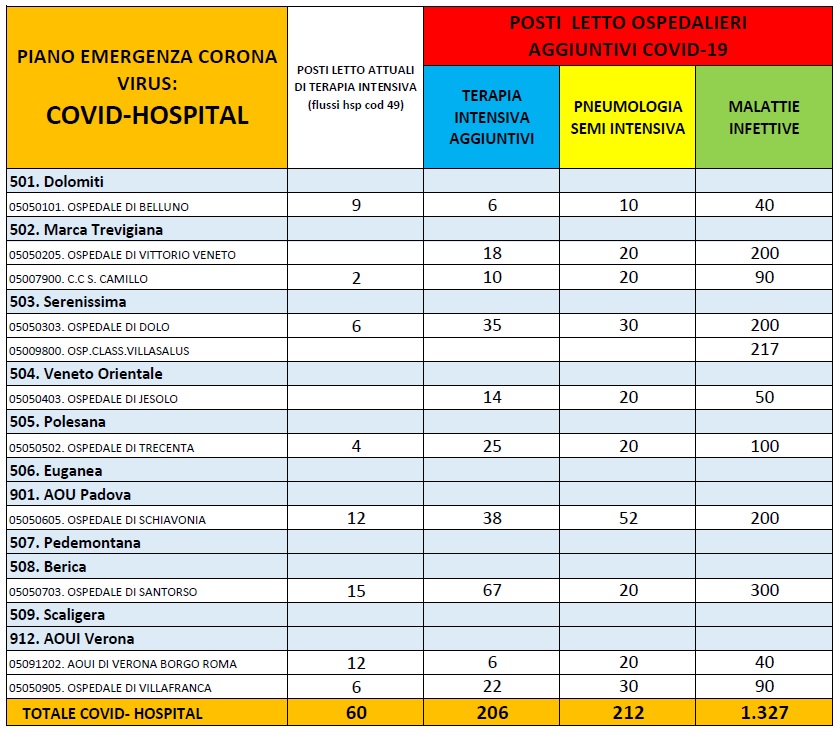 Al totale dei posti letto previsti nelle diverse province, se ne aggiungono poi altri 740 da dedicare alle degenze “normali”, che verranno ricavati con la riattivazione degli ex ospedali di Valdobbiadene, Monselice, Bussolengo, Isola della Scala e Zevio, e 110 posti letto nelle cosiddette “Strutture Intermedie”.