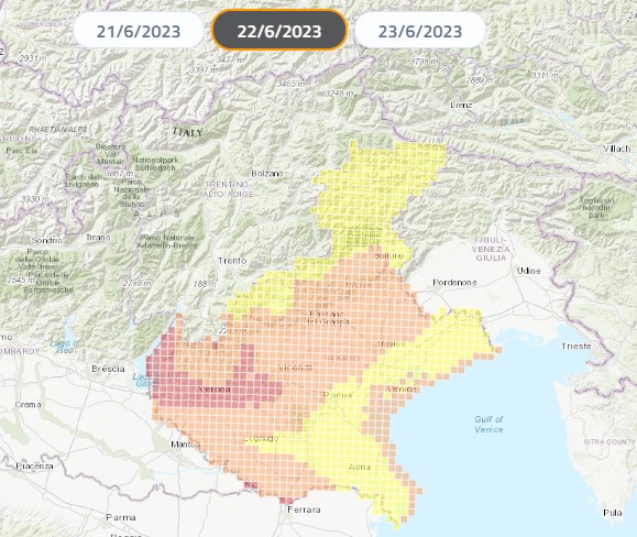 L’espansione di un’alta pressione sul Mediterraneo ha portato, già a partire da sabato scorso, tempo stabile sulla regione; a questo si è aggiunta negli ultimi giorni l’avvezione di aria calda dall’Africa settentrionale, determinando un repentino aumento delle temperature, che, mercoledì 21 giugno, in pianura, hanno diffusamente raggiunto i 33- 34°C e localmente sfiorato i 35°C.