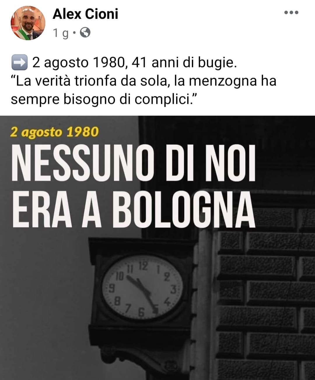 “Gravissimo quel post sulla strage di Bologna, Cioni chiarisca quel NOI”. A chiedere chiarimenti è il Pd dell’Alto Vicentino e il post è quello pubblicato su Facebook dal consigliere comunale scledense di Fratelli d’Italia Alex Cioni il 2 agosto, anniversario della strage di Bologna. Cioni, infatti, sul suo profilo ha condiviso l’immagine dell’orologio della stazione ferroviaria (che segna ancora l’ora in cui esplose la bomba che provocò 85 morti e 200 feriti) corredata dalla frase “Nessuno di noi era a Bologna” e in aggiunta il messaggio: “2 agosto 1980, 41 anni di bugie. La verità trionfa da sola, la menzogna ha sempre bisogno di complici.”
