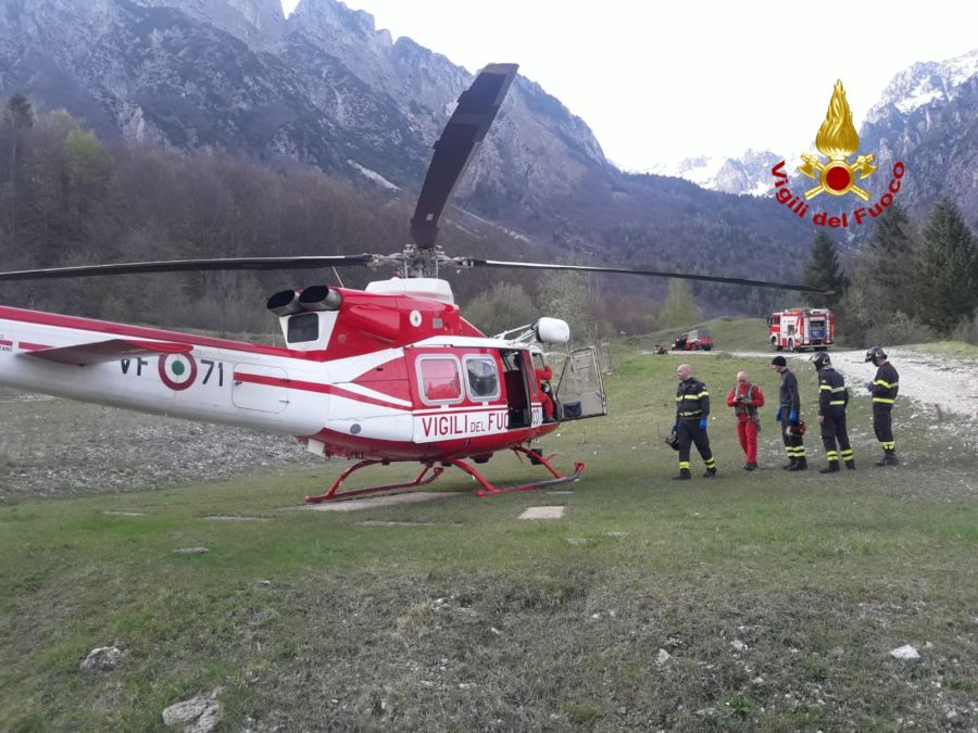 Immediati sono partiti i soccorsi: subito si è levato in volo l’elicottero Drago 71 dei vigili del fuoco che, durante la ricognizione, ha individuato il corpo esanime, in parte ricoperto dalla neve, a circa 1.850 metri di quota nel Boale del Sant’Antonino, a valle del Rifugio Papa. Il velivolo ha così sbarcato con il verricello due pompieri con una barella, dopo aver provveduto ad attrezzarli di ramponi e piccozze forniti da un rifugio.