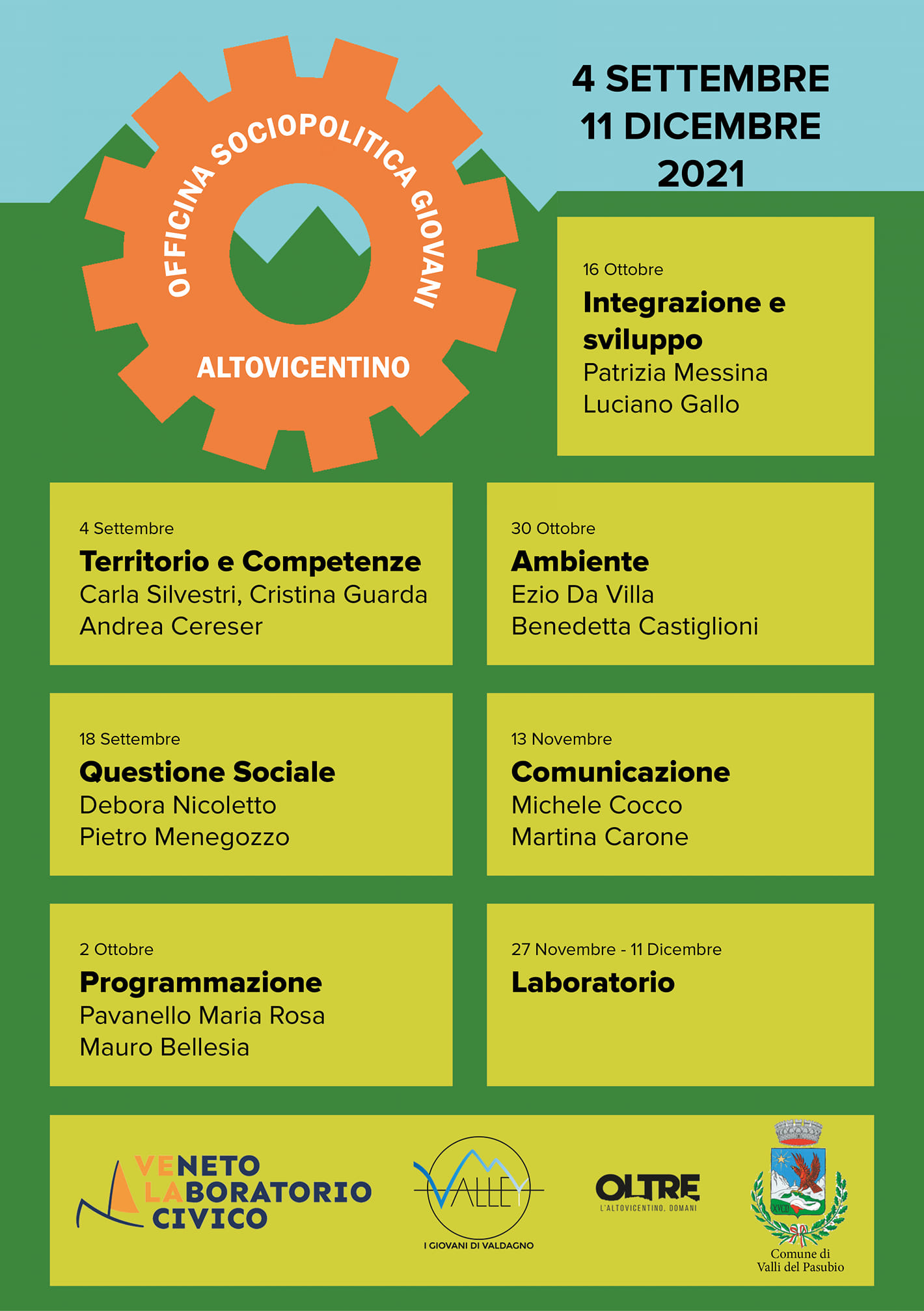 Nel concreto, l’iniziativa si compone di otto incontri, il sabato mattina, a partire dal 4 settembre per due sabati al mese fino ai primi di dicembre. Si terrà in tre diverse sedi: quattro incontri presso i Salesiani di Schio, gli ultimi nell Municipio di Valli del Pasubio e nel mezzo ci sarà una tappa anche a Casa Leila a Valdagno. “L’obiettivo – spiegano i promotori – è quello di conoscere il territorio osservando e frequentando da vicino anche le diverse realtà. I temi scelti vanno dalla suddivisione delle competenze nelle amministrazioni locali alle politiche sociali e ambientali dei comuni, dall’integrazione e le politiche di sviluppo dei territori fino alla comunicazione politica efficace. Tutti gli incontri prevedono l’intervento di relatori e formatori e un confronto laboratoriale a piccoli gruppi sul tema trattato di volta in volta. Gli ultimi due appuntamenti saranno dedicati alla ideazione di un progetto concreto da proporre alle amministrazioni del territorio. L’iniziativa si rivolge a giovani dell’Alto Vicentino fra i 18 e i 35 anni e prevede un piccolo contributo spese di 25 euro. 30 i posti disponibili. Per info e iscrizioni: off.sociopolitica.giovani@gmail.com, facebook.com/OfficinaSociopoliticaAltovicentino
