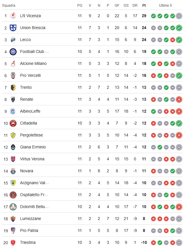 La nota negativa, semmai, arriva dai campi delle altre, per il margine di distacco – rimane sostanzioso, di 5 punti – sulle due inseguitrici che si assottiglia: il Lecco e l’Union Brescia la spuntano di misura in due derby lombardi assai tosti con Renate e Albinoleffe, con Costa e compagni consapevoli che i due ossi duri alle proprie spalle non molleranno la rincorsa al vertice, peraltro sempre saldo in mano e sui piedi di Fabio Gallo e i suoi. Con in vista anche i “Santi” da invocare per il match di domenica prossima allo Stadio Romeo Menti, e il Giana Erminio da affrontare per continuare la striscia di vittorie casalinghe, cinque su cinque fino ad ora. Prima, però, il debutto in Coppa Italia di C, dal 2° turno, con il Pro Vercelli ospite in gara secca (20.30). Da segnalare che a Trento, ieri, il tecnico biancorosso ha dovuto fare i conti con le defezioni multiple in mediana di Cavion, Rada e Pellizzari, oltre a Benassai per il reparto arretrato a partita in corso.