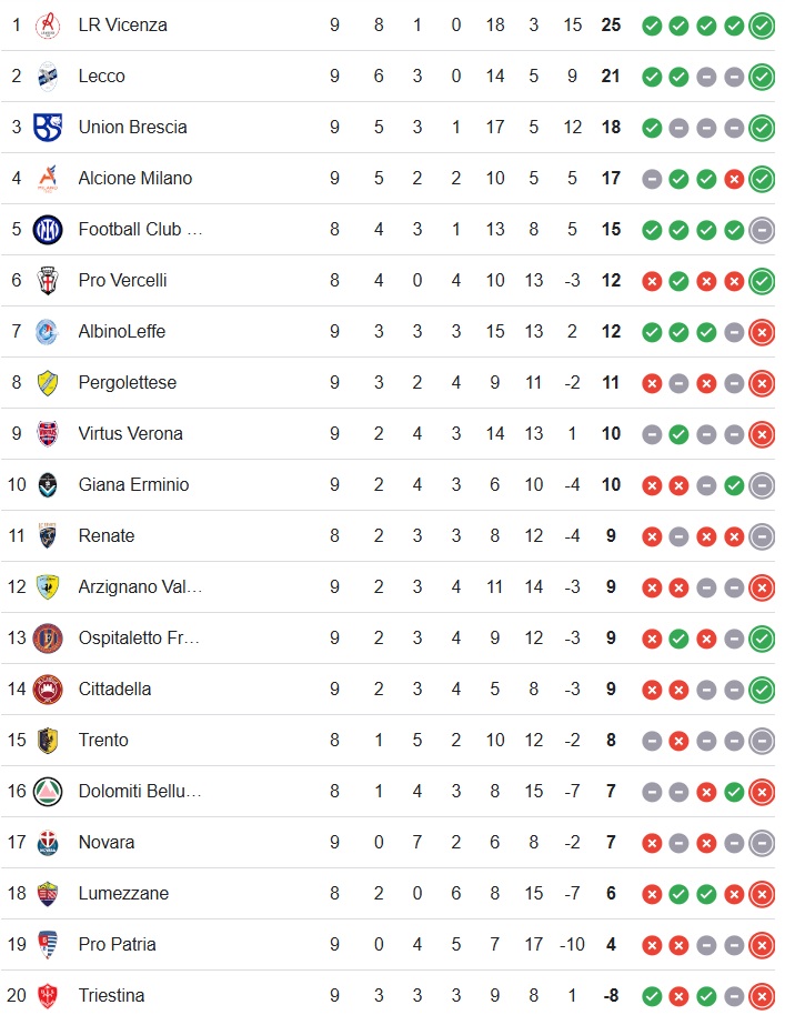 Vincono tutte e quattro le battistrada del girone A di serie C, con il L.R. Vicenza che in extremis risponde alle inseguitrici, battendo 2-1 la Virtus Verona e mantenendo i 4 punti di margine sul Lecco e 6 sull’Union Brescia. Stesso punteggio finale ma con esito infausto per l’Arzignano Valchiampo, che esce sconfitto di misura dal duello con Ospitaletto Franciacorta e rimane a 9 punti in classifica, mentre la capolista biancorossa si issa a quota 25 punti e incamera la settima vittoria consecutiva, ottava in 9 gare. Oltre 10.200 i tifosi di casa che hanno gemito lo Stadio Menti sabato pomeriggio, solo 6 gli ospiti ufficialmente registrati.
