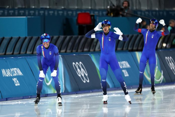 Non ce n’è per il team statunitense: con una incredibile progressione, gli azzurri capitanati dal vicentino Davide Ghiotto si portano a casa l’oro nell’inseguimento a squadre nel pattinaggio di velocità alle Olimpiadi invernali Milano Cortina 2026. Davide Ghiotto Andrea Giovannini e Michele Malfatti hanno vinto oggi (17 febbraio) la finale contro gli Usa. L’Italia aveva fatto segnare il miglior tempo ai quarti e nel primo pomeriggio aveva battuto i Paesi Bassi. L’impresa al Milano Speed Skating Stadium.