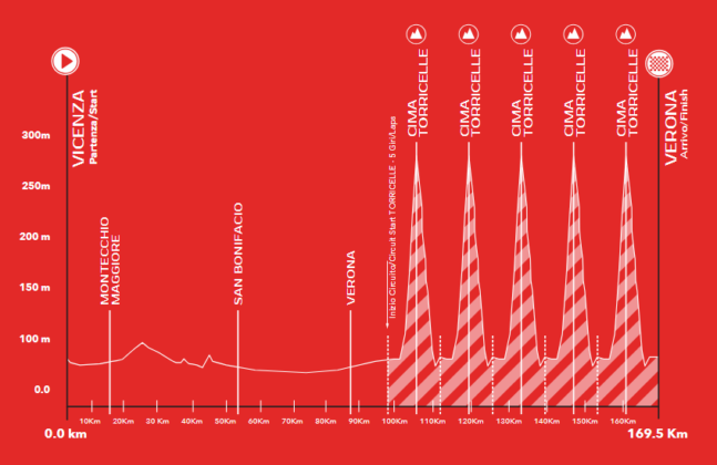 A quel punto inizierà il primo dei cinque giri del circuito finale, lungo 15 chilometri e caratterizzato dalla salita delle Torricelle, con una pendenza media del 5,1%, con una punta dell’8% che si incontrerà verso la fine del primo chilometro di scalata. In vetta mancheranno solo 8,5 chilometri al nuovo passaggio sulla linea d’arrivo (e, all’ultima tornata, al traguardo), i primi 5 dei quali di una discesa con un paio di passaggi un po’ tecnici mentre gli ultimi 3,5 pianeggianti, proponendo inoltre un rettilineo finale di poco più di 500 metri.
