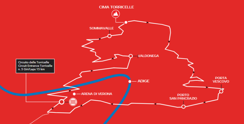 La prima metà del percorso è costituita da un tratto in linea che presenta solo qualche lieve ondulazione nei primi 35 chilometri, ma che per il resto sarà totalmente pianeggiante e porterà il gruppo a giungere nella città scaligera dopo un’ottantina di chilometri dal via, transitando per la prima volta sul traguardo di Corso Porta Nuova (a due passi dall’Arena) ai -75 dalla conclusione.