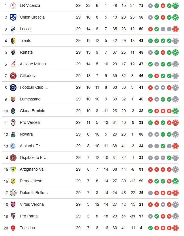 Lo sguardo d’insieme ai numeri del girone A mostra una Triestina ormai prossima a salutare la categoria, ormai ancorata a 4 punti in classifica: niente miracolosa rimonta dei 23 punti di penalizzazione accumulati per gli illeciti di natura amministrativa. Altra seria candidata a a retrocedere senza nemmeno passare per i playout è la Pro Patria, che non dà segnali di ripresa e che potrebbe rimanere staccata dalla quintultima: se il torneo si concludesse oggi sarebbe serie C. Pericolante pure la Virtus Verona.