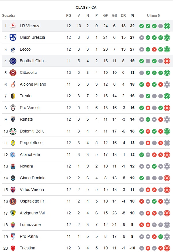 Il 2-1 permette insomma al L.R. Vicenza di legittimare la vetta in solitaria tenendo a debita distanza (5 punti) la coppia di inseguitrici lombarde, con in particolare l’Union Brescia che si dimostra ancora al galoppo – il poker di successi filati – ma anche con un Lecco debordante alla luce della cinquina amara per gli colori vicentini, quelli dell’Arzignano. Avanza a suon di vittorie anche il Cittadella dopo l’avvio nero di torneo in serie C, con i padovani a mettere in serie 12 punti in quattro partite e appostarsi subito dietro l’Inter Under 23, guarda il caso la prossima sfidante della capolista. Si giocherà domenica all’ora di pranzo in trasferta, con il calcio d’inizio alle 12.30 allo U-Power Stadium di Monza. Sulla panchina nerazzurra l’ex fiamma Stefano Vecchi.