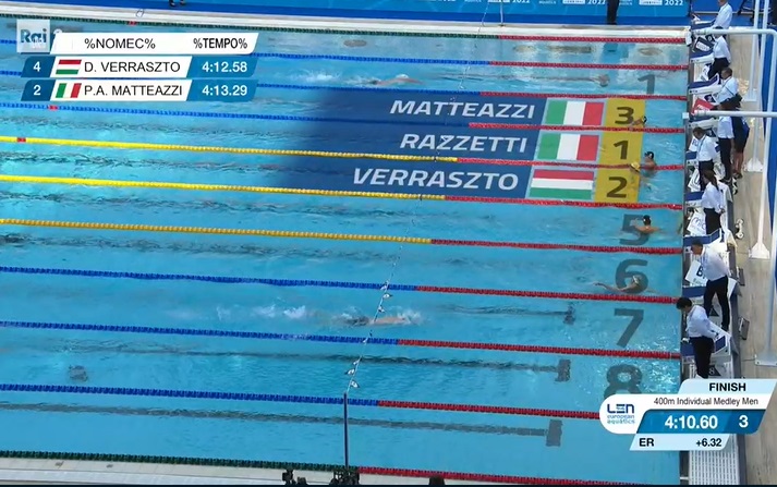 Straordinario terzo posto per il vicentino Pier Andrea Matteazzi nei 400 metri stile misto agli Europei di nuoto iniziati ieri a Roma. Il giovane nuotatore di Vicenza, classe 1997, ha conquistata giovedì la medaglia di bronzo con 4:12:58, dietro all’italiano Alberto Razzetti (amico e rivale di sempre), medaglia d’oro con il tempo di 4:10.60, e l’ungherese David Verraszto, argento in 4:12.58.