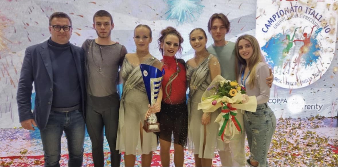 In primis, medaglia d’oro, nell’affollata categoria Quartetti Divisione Nazionale per il gruppo Aletheia (Montebello H.E.P.): hanno svettato fra i 28 gruppi, sbaragliando la concorrenza con 72.30 punti grazie alla performance “La sacerdotessa di Atena”, una donna dal fascino mortale, incantatrice di uomini che una maledizione fa conoscere sotto il nome di Medusa. In pista, Raffaello Bergamini, Sofia Bolpato, Irene Dorati e Maria Rossi, allenati da Debora Codega e Nicholas Masiero.
