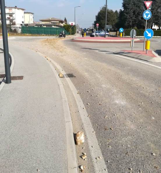 Giunta sul posto, la pattuglia ha potuto constatare come il materiale fosse sparso per centinaia di metri, dalla rotatoria del Ponte di Ferro, lungo via Valsugana e quindi anche in via Val Cismon. Qui un paio di auto in transito hanno subito anche vari danni alla carrozzeria.