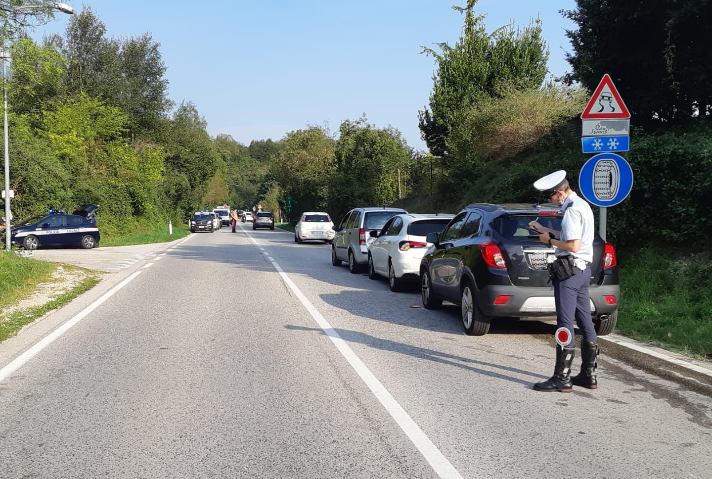 Si forma una colonna d’auto sulla carreggiata che porta a valle da Cogollo del Cengio a Piovene Rocchette, tre veicoli attendono diligentemente la svolta verso sinistra della “capofila”, ma da dietro piomba la “quinta incomoda” che centra il fanalino di coda del gruppo dando vita a un tamponamento multiplo.