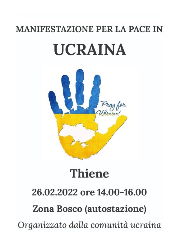 Sta prendendo corpo in queste ore febbrili, proprio all’indomani dello scoppio concreto del conflitto Russia-Ucraina, l’idea di una manifestazione pubblica che si terrà nel primo  pomeriggio di sabato a Thiene, con invito rivolto alle decine di cittadini ucraini – come noto vivono qui molte donne che lavorano come badanti – che risiedono nell’Altovicentino (e non solo) e a chiunque volesse partecipare. E, come sottolineano gli organizzatori, rivolta a tutti coloro che credono nel valore della pace.