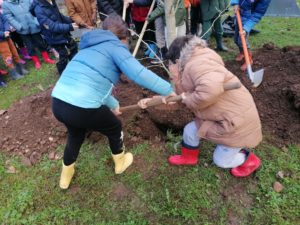 Ai giardini del Bosco i protagonisti sono stati i bambini, che a tutti i costi hanno voluto prendere in mano badili più grandi di loro per mettere a dimora le due nuove piante, simbolo della nuova vita.