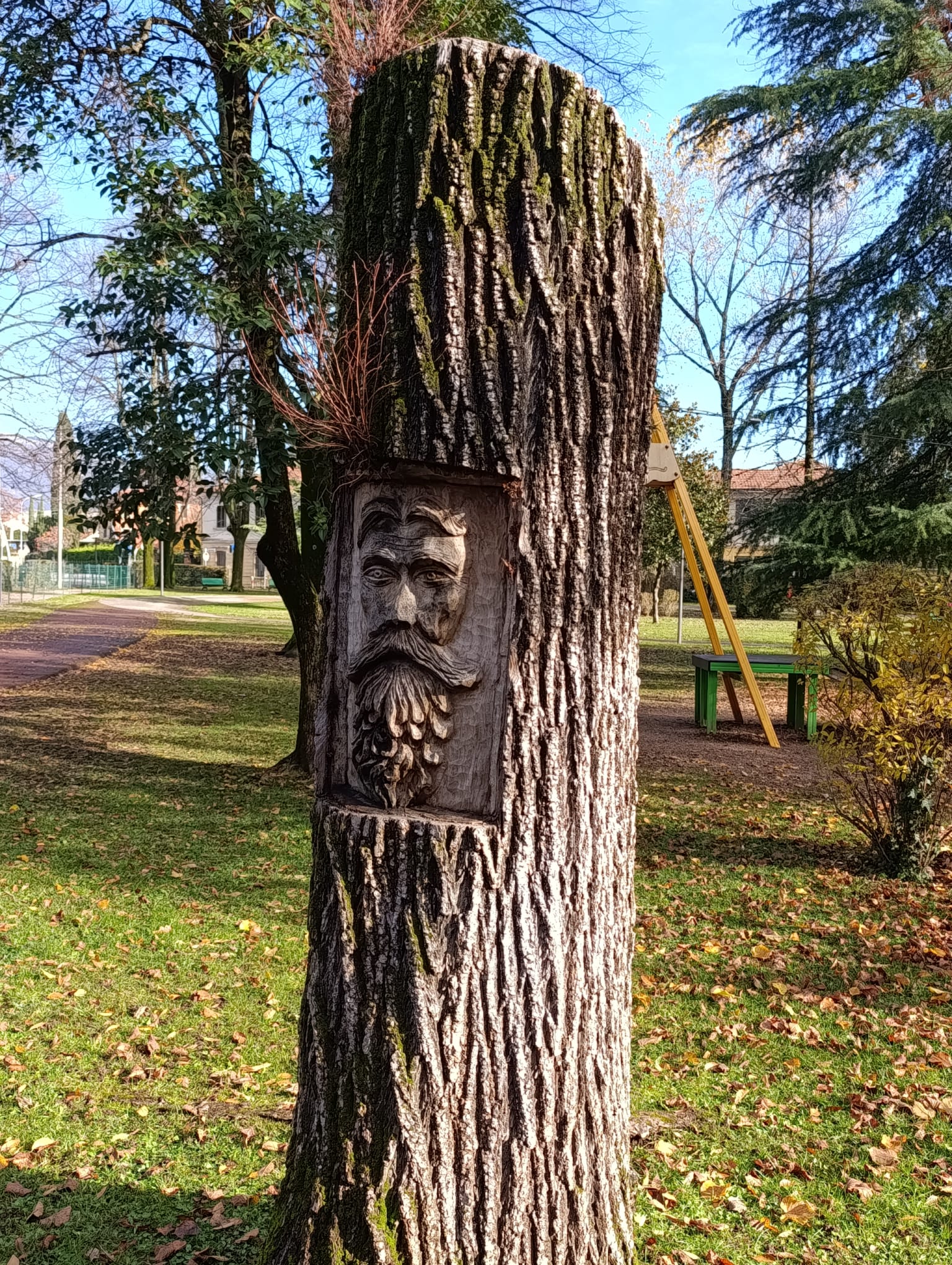 Da un lato, in occasione della Giornata Nazionale degli Alberi, gli alunni delle scuole elementari Talin hanno piantato due ginko biloba affiancando l’amministrazione comunale nel suo impegno per la difesa del verde cittadino. Dall’altro lato l’assessore all’Ecologia Nazareno Zavagnin ha voluto far incidere il volto di un uomo sul tronco di un albero tagliato in quanto morto, come simbolo della storia della pianta stessa.