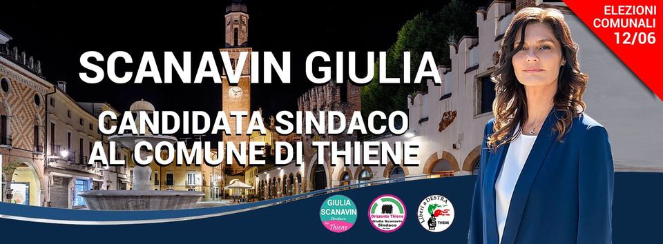 E’ il turno di Giulia Scanavin, che corre con tre liste: Orizzonte Thiene Giulia Scanavin Sindaco per Thiene, Liberi a Destra Thiene e Giulia Scanavin Sindaco per Thiene.