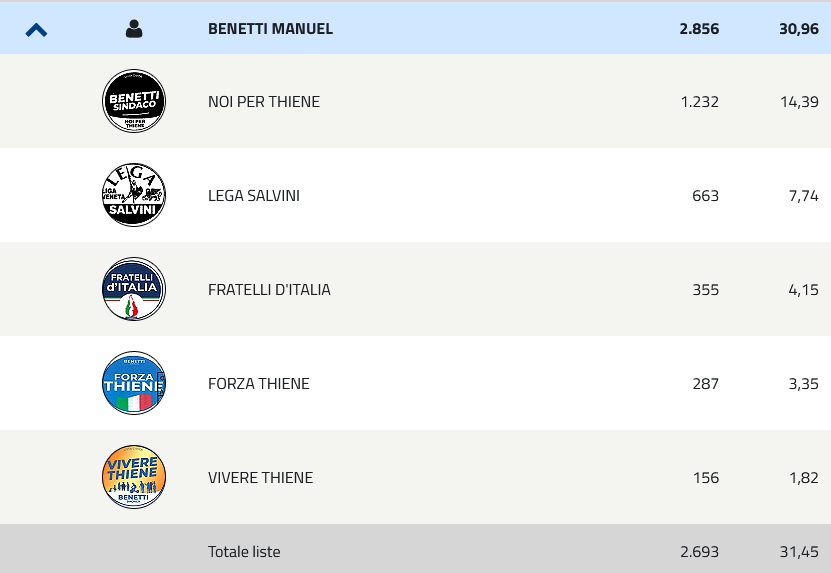 Lega, Fratelli d’Italia e Forza Italia (Forza Thiene) si schiantano con rispettivamente il 7,74%, il 4,15% e il 3,35%, mentre Benetti da solo, con la civica a suo nome, porta a casa il 14,39%, il risultato elettorale migliore per singola lista.