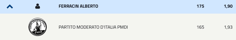 Nulla di fatto anche per Alberto Ferracin, che con il suo 1,9% di voti ampiamente pronosticati ha comunque condotto una campagna elettorale corretta e democratica. Niente toni eccessivi, ma solo le sue idee, a tratti stravaganti così come il suo look, ha colpito per la simpatia e per la voglia di mettersi in gioco senza rompere le scatole a nessuno, ma solo per perseguire il suo obiettivo, quello di capire se nel territorio c’è spazio per il Partito Moderato d’Italia. Al momento, si direbbe di no.