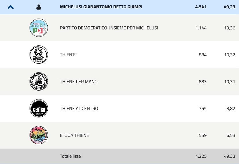 Con sempre meno elettori che decidono di andare alle urne, la vera conferma delle elezioni amministrative thienesi sono state le liste civiche, che con un notevole ruolo nelle percentuali delle votazioni hanno portato al ballottaggio Giampi Michelusi e Manuel Benetti con un totale – rispettivamente – del 49,23% e del 30,96% dei voti. Ecco la situazione del voto nelle liste delle diverse coalizioni (qui tutti i dati).