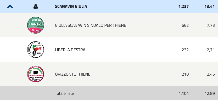La candidata sindaco Giulia Scanavin si è rivelata una sorpresa alle amministrative thienesi. Il suo nome ed il fatto che fosse “una donna” l’hanno fatta arrivare al 13,41% e potrebbe essere lei, in caso di alleanza con Benetti, a fare la differenza al ballottaggio del 26 giugno. Sempre ammesso che qualche “big” delle liste in appoggio a Benetti sia eventualmente d’accordo nel tirarsi indietro per barattare con Scanavin e il suo gruppo qualche posto in giunta.