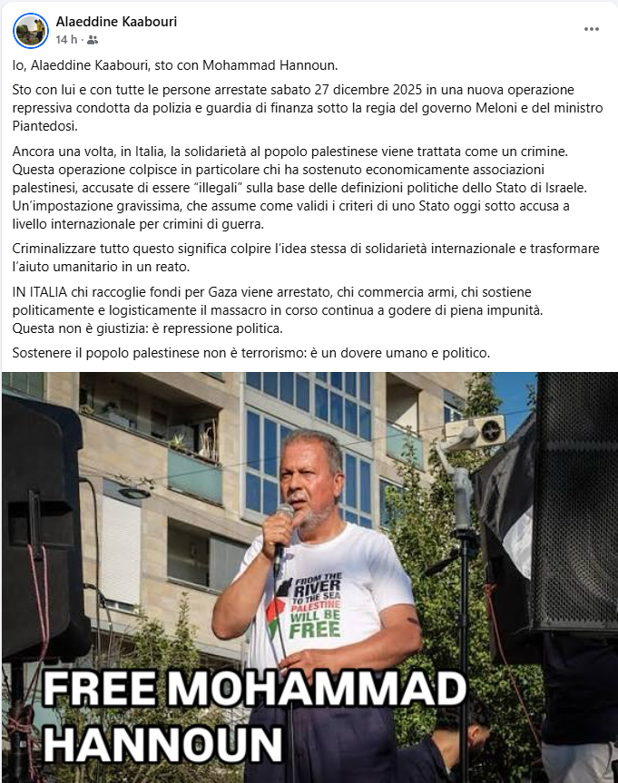 Sta provocando reazioni immediate e un acceso dibattito politico il post pubblicato sui social da Alaeddine Kaabouri, consigliere comunale di maggioranza a Thiene e delegato alle politiche giovanili, in cui esprime solidarietà a Mohammad Hannoun, arrestato il 27 dicembre nell’ambito di un’operazione antiterrorismo con l’accusa di aver finanziato Hamas attraverso organizzazioni presentate come benefiche.