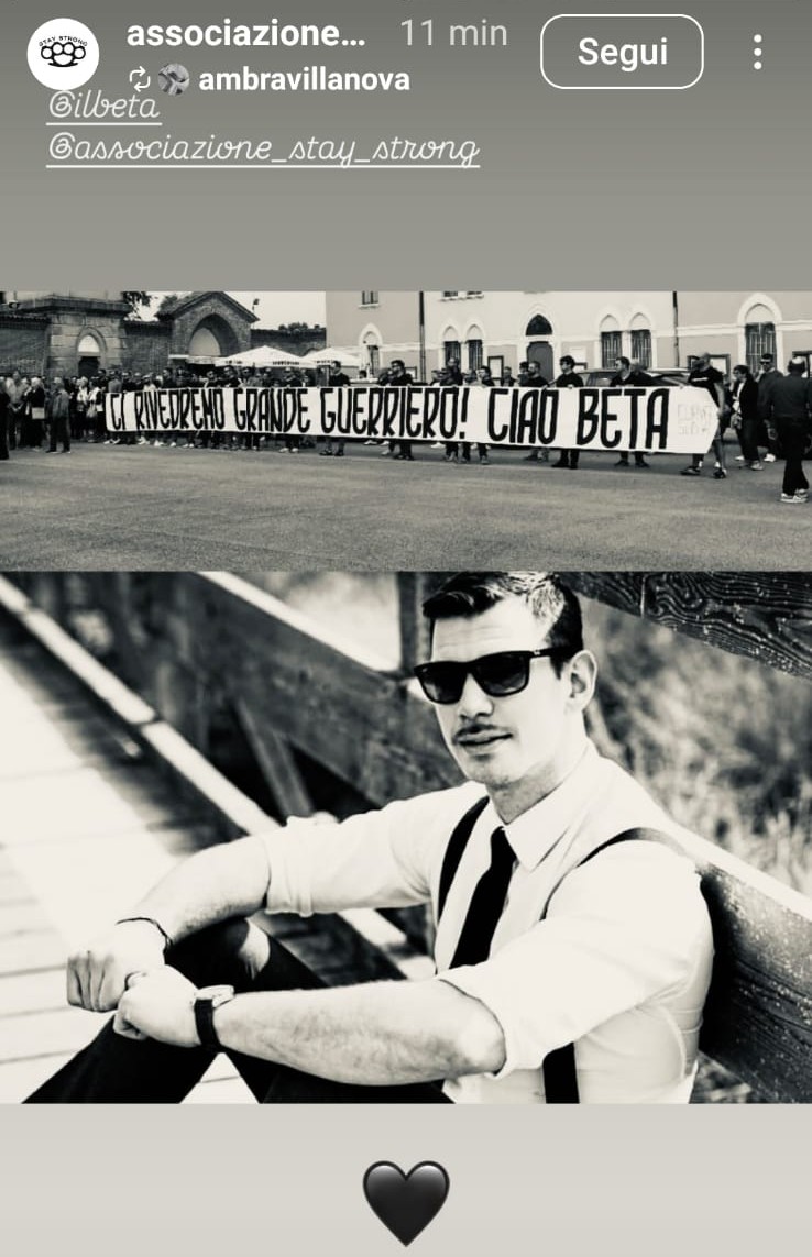 Ci rivedremo grande guerriero! Ciao Beta!” è la scritta portata ieri nella curva del Menti durante Vicenza-Ternana dagli ultras in ricordo dell’amico Riccardo Bettanin, il papà 36enne di Sarcedo morto per un male aggressivo e il cui funerale si è svolto nella chiesa di Santa Maria dell’Olmo a Thiene oggi pomeriggio, 26 maggio. E proprio fuori nel piazzale della chiesa dei Cappuccini, prima della partenza per l’ultimo viaggio verso il cimitero di Madonnetta di Sarcedo. i compagni di curva hanno disteso una seconda volta lo striscione in ricordo del loro amico.