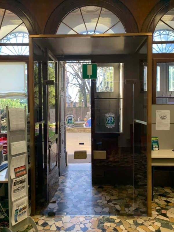 Sarà inserita nell’attuale serramento d’ingresso una porta automatica, più igienica e funzionale, in grado di agevolare l’accesso a persone con difficoltà o passeggini, in sostituzione dell’attuale bussola a vetri con telaio in alluminio; l’attuale serramento in legno esistente che occupa tutta la parete di ingresso verrà smontato, ripulito e restaurato, anche nella parte della vetrata. Saranno restaurati anche i due ingressi laterali con l’eliminazione delle attuali bussole d’ingresso realizzate alcune anni fa. Saranno quindi riqualificati i servizi igienici al piano terra destinati al pubblico e ai servizi demografici. L’ultima area interessata dai lavori sarà, infine, quella dell’ingresso secondario sul retro della sede municipale: nel rispetto delle esigenze di tutela monumentale, sarà adeguata l’attuale scala esterna con gradini in marmo realizzando un nuovo pianerottolo per garantire adeguata sicurezza in caso di emergenza, riutilizzando tutti i gradini esistenti.