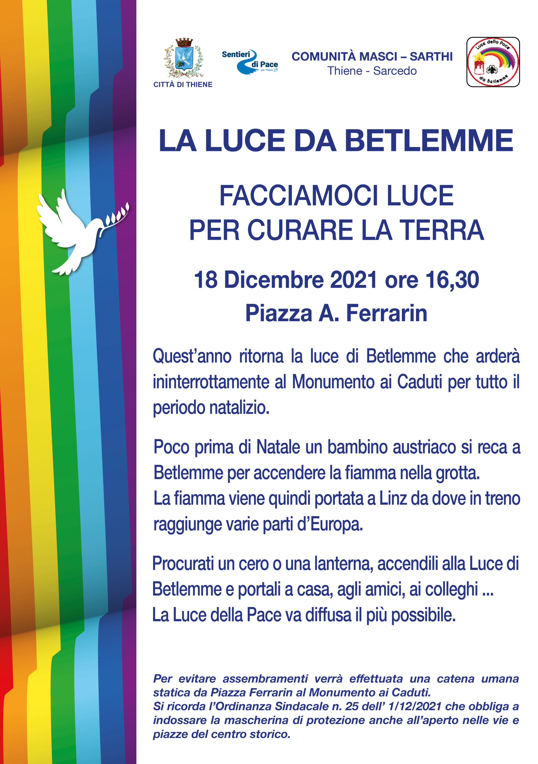 La Luce della Pace che ogni anno parte dalla chiesa della natività di Betlemme per raggiungere molti stati europei, da qualche anno, grazie alla Comunità Masci SarThi e a Sentieri di Pace arriva anche a Thiene e arde ininterrottamente per tutto il periodo natalizio al Monumento ai Caduti. A Thiene arriverà sabato 18 dicembre 2021 alle ore 16.30 e verrà accolta davanti al Municipio da dove, con una catena umana statica nel rispetto della normativa antiassembramento, verrà condotta al Monumento ai Caduti dove arderà senza sosta per tutto il periodo natalizio, come simbolo di speranza, di pace e di serenità.