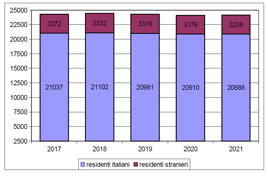 La popolazione di cittadinanza straniera risulta in aumento: 3.238 contro i 3.176 del 2020, e rappresenta il 13,42% della popolazione. Le nuove cittadinanze italiane sono state 129. Di queste 129 sono 28 quelle concesse a cittadini stranieri che hanno a suo tempo contratto matrimonio con cittadino/a italiano, 49 quelle per aver raggiunto i dieci anni prescritti dalla legge di residenza in Italia, 39 perché figli minori conviventi, 2 perché con avi italiani, 11 perché diciottenni, nati in Italia da genitori stranieri, che hanno fatto richiesta della cittadinanza.