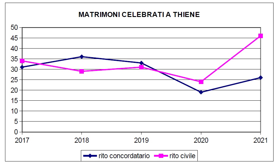 Un dato interessante è quello che riguarda il numero di matrimoni. Nel 2021 sono stati celebrati 72 matrimoni, 29 in più rispetto al 2020 che ha visto pronunciati solo 43 “Sì” (ma va ricordato che quello fu l’anno del lockdown e delle maggiori restrizioni, sul fronte assembramenti e cerimonie). Risultano essere più numerosi i riti civili, ben 46, rispetto ai 26 matrimoni concordatari che sono stati celebrati nel corso del 2021. Le separazioni davanti all’Ufficiale dello Stato Civile sono state 8, i divorzi 15 e 4 le trascrizioni di negoziazione assistita effettuata davanti all’avvocato. Nell’anno 2021 non è stata registrata nel comune di Thiene nessuna Unione Civile.