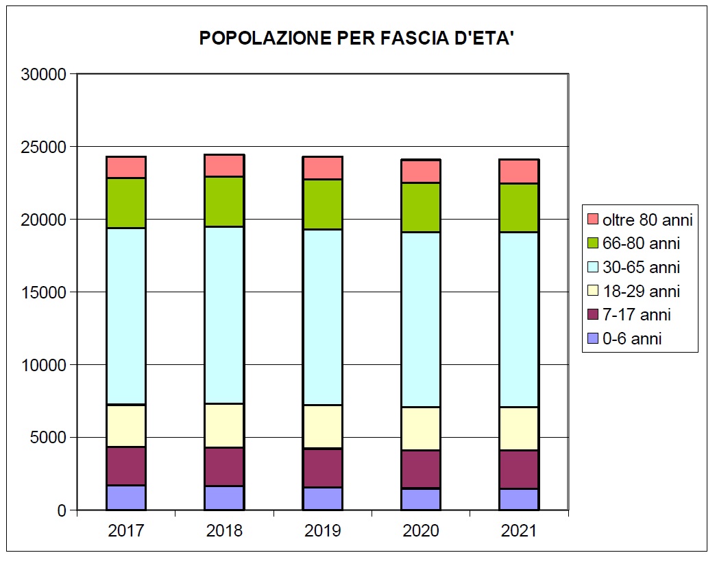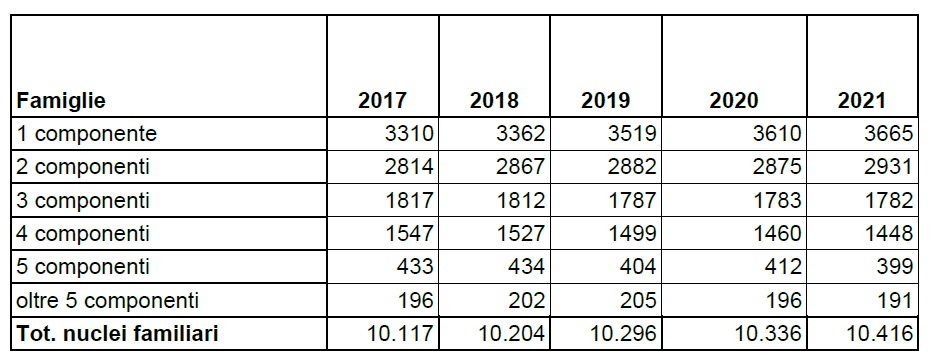 Sono state registrate all’Anagrafe 9 nuove convivenze di fatto, in diminuzione rispetto al 2020, anno in cui ne sono state registrate 15. I cittadini centenari sono sei, uno in più rispetto al 2020 (1 maschio e 5 femmine); la più anziana è una signora di 104 anni. L’invecchiamento della popolazione emerge dall’indice di vecchiaia (rapporto percentuale tra la popolazione over 65 e quella in età 0-14 anni) che per il 2021 attesta 155 anziani per ogni 100 giovani, un dato in crescita: nel 2020 tale indice era 153, nel 2021 sale a 155.