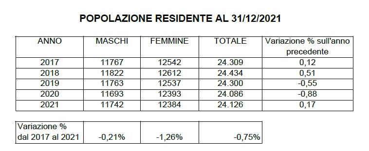 Tutte le statistiche marcano un segno positivo: popolazione, nati, famiglie, matrimoni; è un’indicazione importante che ci stimola a mantenere questo regolare trend, garantendo uno stile di vita corrispondente a una città in costante crescita. I nati nel 2021 sono stati 190 e i morti 274; la differenza tra nati e morti è il saldo naturale, che resta negativo, ma che segna un -84 rispetto al -126 del 2020, anno in cui si sono registrati 184 nati e 310 morti. Per i fiocchi azzurri i nomi scelti più diffusi sono quelli di Leonardo, Alessandro, Edoardo e Lorenzo, mentre per i fiocchi rosa sono Emma, Matilde e Vittoria.