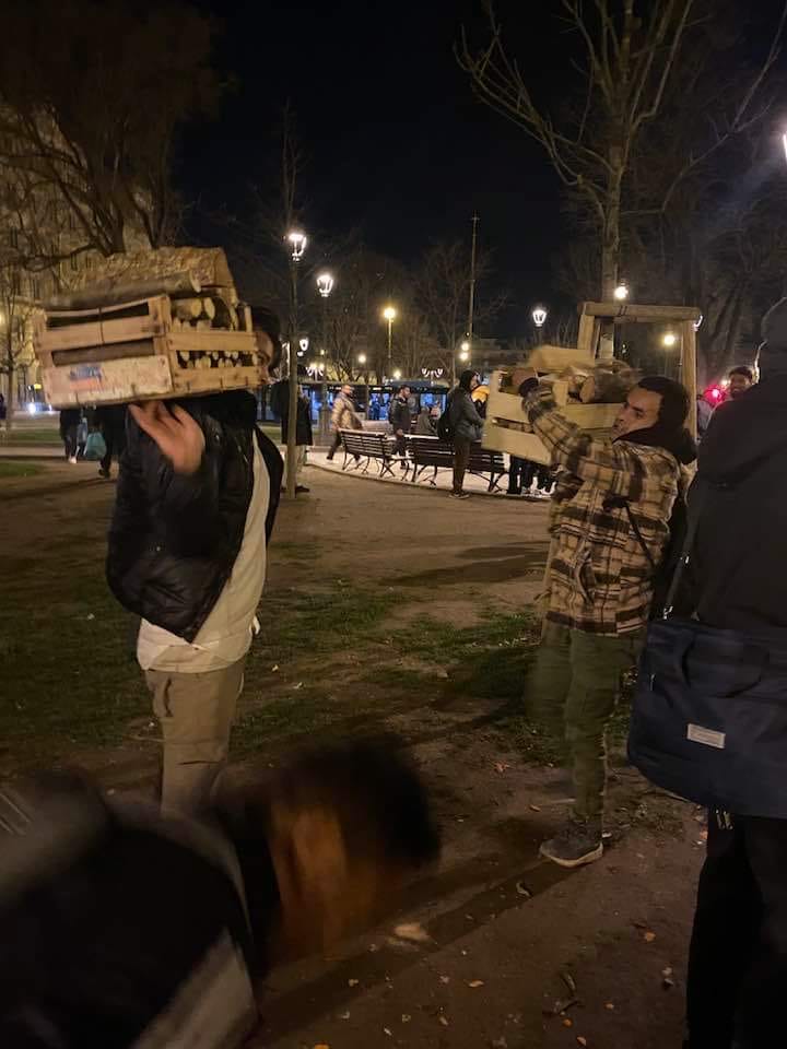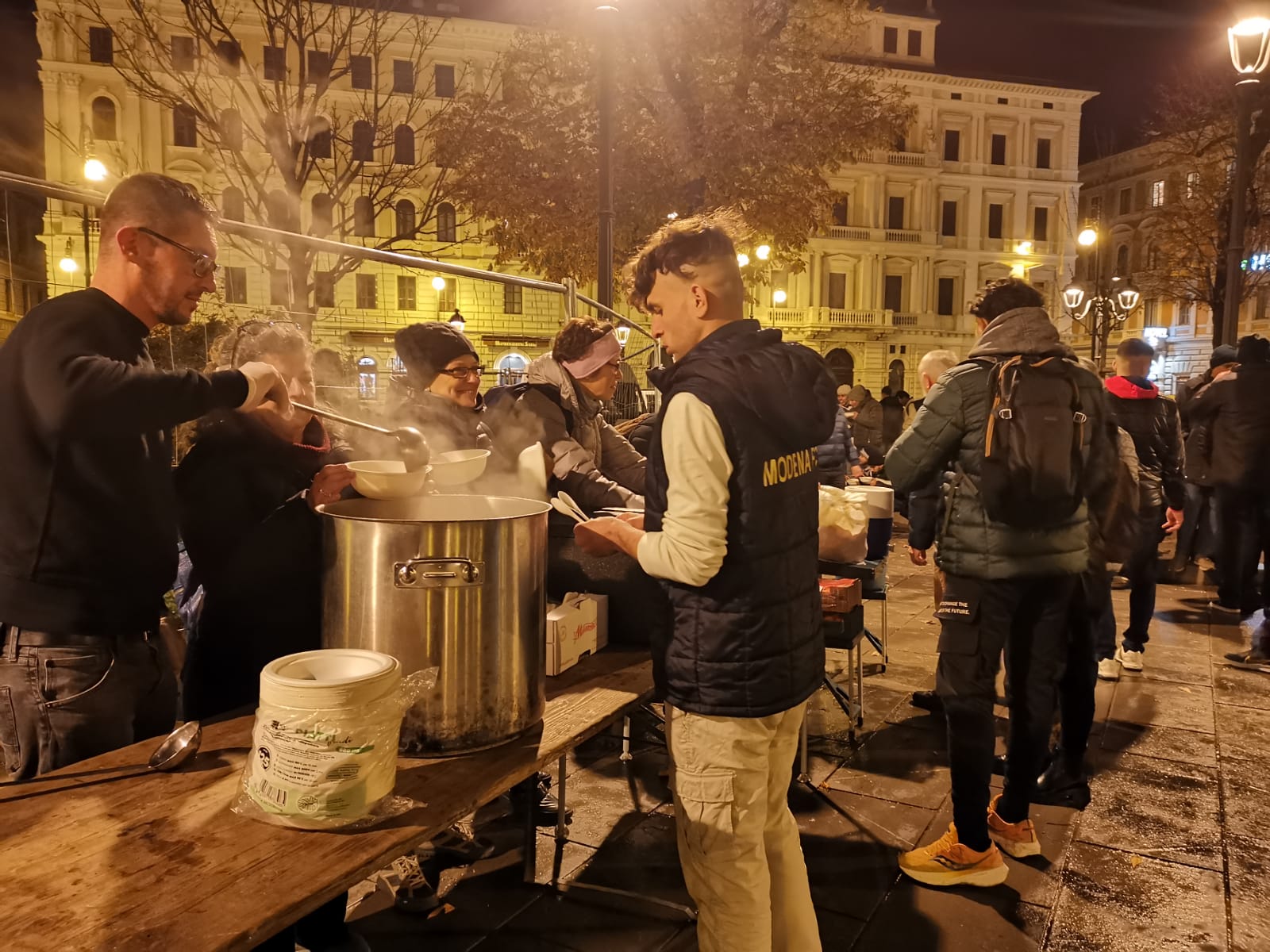 C’è chi procura vestiario, chi il cibo in grandi quantità, chi si da da fare in cucina, chi porta la legna e recupera l’abbigliamento pesante, chi organizza la trasferta, chi va fisicamente a Trieste a portare e distribure il cibo nei giardini di piazza della Libertà, a pochi passi dalla stazione ferroviaria, dal vecchio porto e dal famigerato “silos”, il grande edificio (di proprietà privata) abbandonato e che sorge a fianco della stazione ferroviaria dove dormono sotto tende di fortuna e in mezzo ai topi e alla sporcizia (e se piove, all’acqua) i migranti della rotta balcanica in arrivo dalla Slovenia: a volte sono poco più di cinquanta, più spesso duecento e oltre.