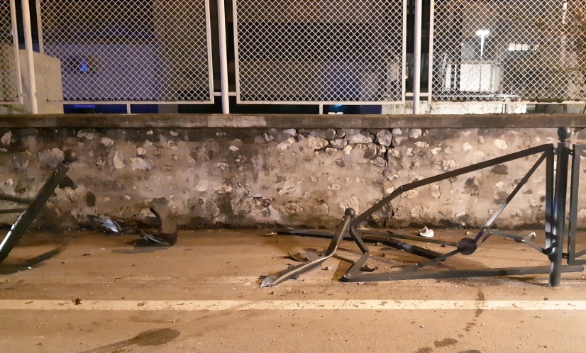 Uscita di strada in centro: illeso guidatore ubriaco, divelta la ringhiera della pista pedonale