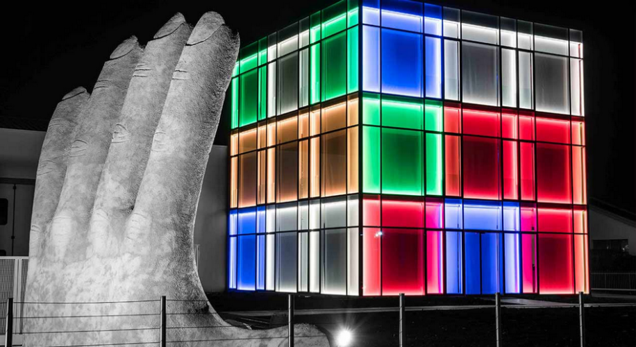 Sua, anche l’idea di realizzare nella palazzina che ospita gli uffici una illuminazione scenografica, realizzata da Olev su progetto dell’ingegner Gabriele Thiella, che ha portato all’azienda un enorme ritorno d’immagine: il risultato è infatti un enorme “cubo di Rubik” che da una determinata prospettiva pare tenuto dalla mano in cemento. Idea anche questa di Panozzo, che è così riuscito nell’intento di creando molta pubblicità attorno al brand e a un’azienda la cui sede poteva passare inosservata fra molte altre (e invece si distingue decisamente).