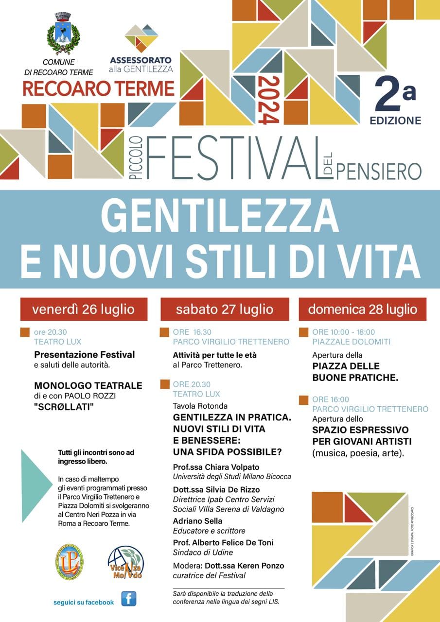 Dal 26 al 28 luglio torna a Recoaro Terme il Piccolo Festival del pensiero. L’evento, che quest’anno giunge alla sua seconda edizione, avrà come focus il tema “Gentilezza e nuovi stili di vita“. Curata dalla dottoressa Keren Ponzo, l’iniziativa è promossa dall’assessorato alla Gentilezza del Comune di Recoaro Terme ed in collaborazione con la Rete Vicenza Mondo e l’Unità Pastorale di Merendaore, Parlati, Recoaro Terme, Rovegliana.