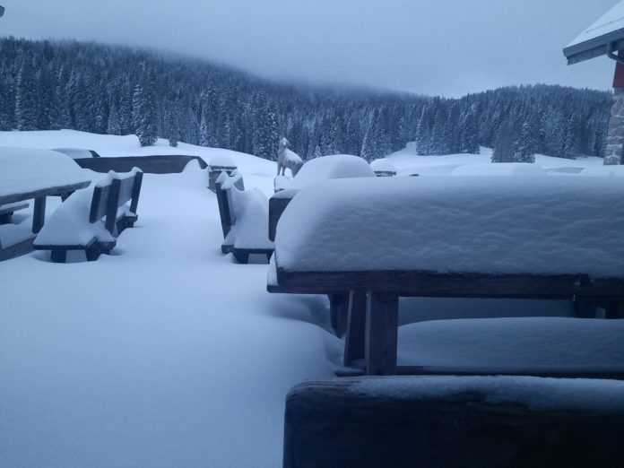 A Rifugio Campogrosso, proprio nel cuore delle Piccole Dolomiti, a quota 1.450 metri si misurano da ieri dai 30 ai 40 centimetri di coltre bianca (territorio montano di Recoaro). Poco lontano stessa “visione” dal Rifugio Gingerino (1.600 circa). Paesaggi tipicamente invernali anche. Al Rifugio Bertagnoli sulle cime Tre Croci solo una spuzzata di bianco nella giornata di ieri, ma qui l’altitudine di abbassa a 1.225 metri – qui siamo a Crespadoro – con le vette intorno più imbiancate. Ieri mattina prima dell’alba strada da liberare con mezzo “rompineve” per raggiungere Rifugio Val Formica a Cima Larici (1.650 metri), con tutto l’Altopiano dei Sette Comuni coperto di neve primaverile. Sono 60 invece i centimetri “dichiarati” al Rifugio Campolongo, sempre sull’Altopiano, nel comune di Rotzo.