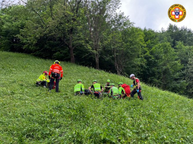 Dopo essersi calati con le corde, i soccorritori lo hanno raggiunto: era seduto, vigile, seppur in stato soporoso a causa del sospetto grave trauma cranico che aveva riportato e che ha subito impensierito i tecnici intervenuti. La squadra gli quindi ha prestato le prime cure, per poi imbarellarlo e sollevarlo un centinaio di metri per contrappeso fino al sentiero e da lì trasportarlo in una radura nelle vicinanze.