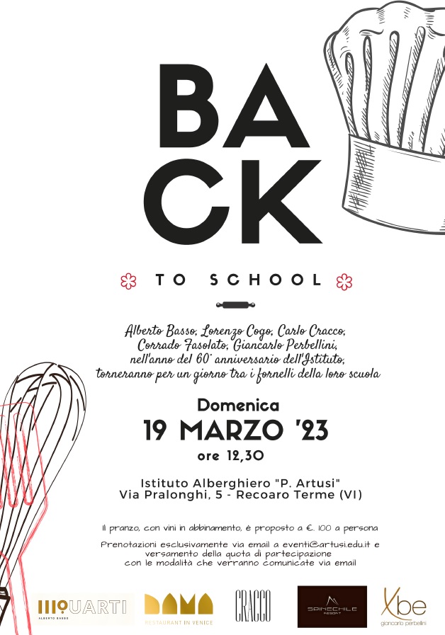 Dopo diversi anni di stop obbligato a causa della pandemia, domenica 19 marzo torna all’Ipssar “Pellegrino Artusi” di Recoaro Terme “Back to school” giunto alla sua terza edizione. In occasione del 60° anniversario dalla fondazione della scuola, una collaborazione incredibile vedrà schierarsi tra i fornelli cinque noti chef stellati, un tempo studenti dell’istituto: Alberto Basso, Lorenzo Cogo, Carlo Cracco, Corrado Fasolato e Giancarlo Perbellini per curare la preparazione di un pranzo di altissimo livello per centosessanta ospiti, insieme alle studentesse e agli studenti della scuola, con il supporto dei docenti dei laboratori di Accoglienza, Cucina, Sala e Pasticceria.