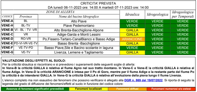 L’allerta gialla è dichiarata per i bacini Alto Brenta-Bacchiglione-Alpone; Adige-Garda e Monti Lessini; Basso Brenta – Bacchiglione; Livenza-Lemene-Tagliamento.